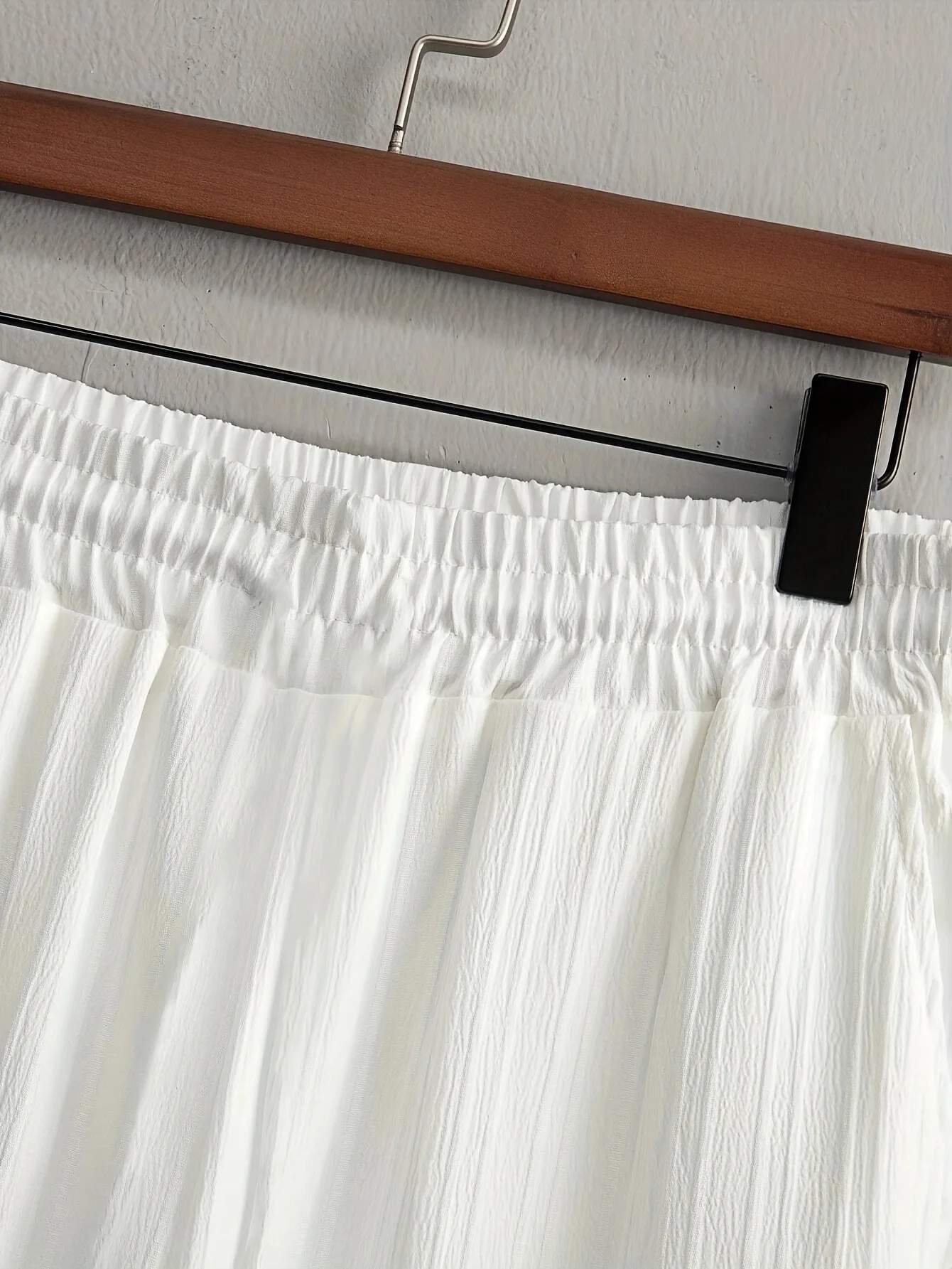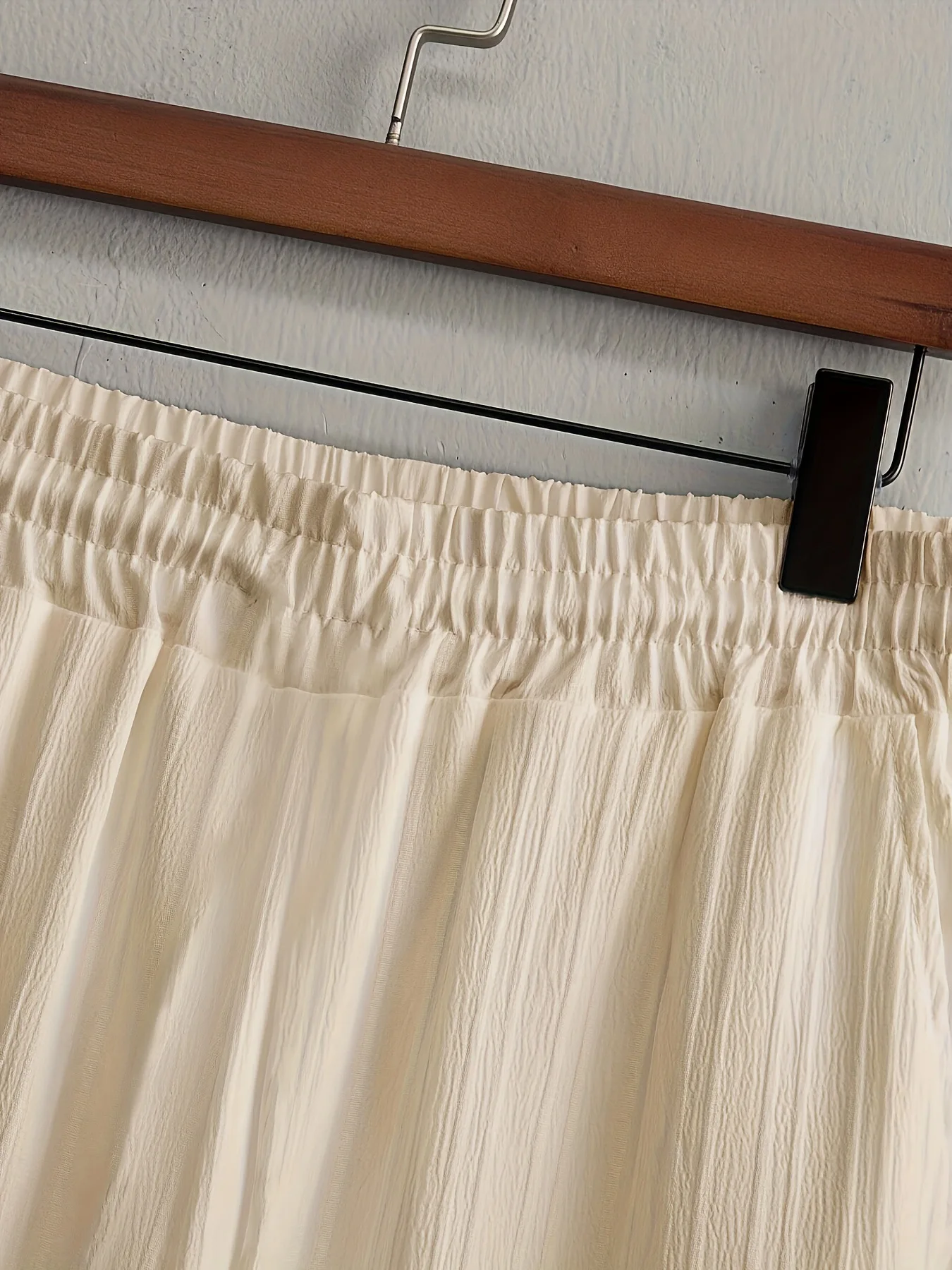Crafted from a lightweight silk-touch blend, this two-piece set offers a cool drape and soft, ripple-textured feel against the skin. The relaxed collar and straight-leg design bring a polished edge to casual comfort, ideal for easy, breathable style all day.