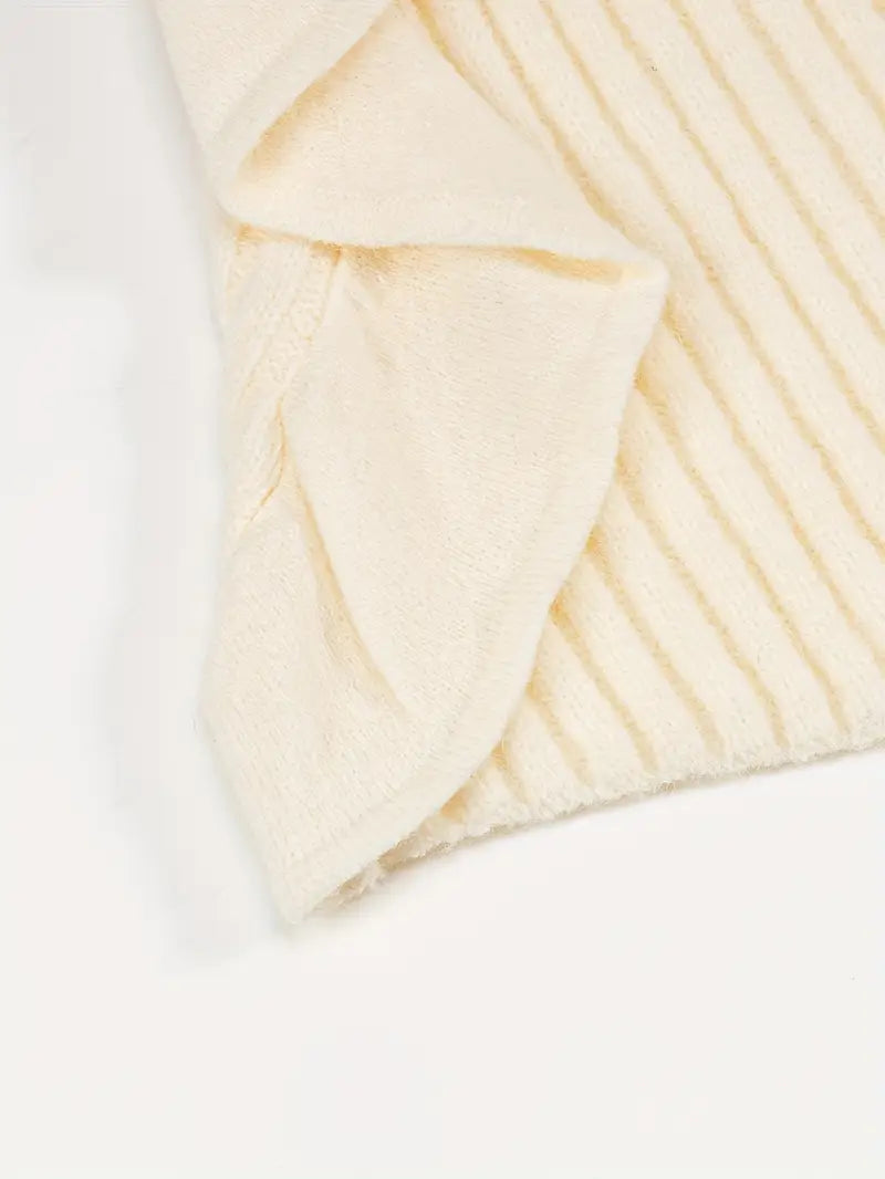 Crafted from a brushed knit blend that feels like a cloud, this skirt wraps the body in soft vertical ribs that stretch gently with movement. A cascading ruffle with a sculpted rosette detail blooms from the hip, bringing a quiet drama to every step.